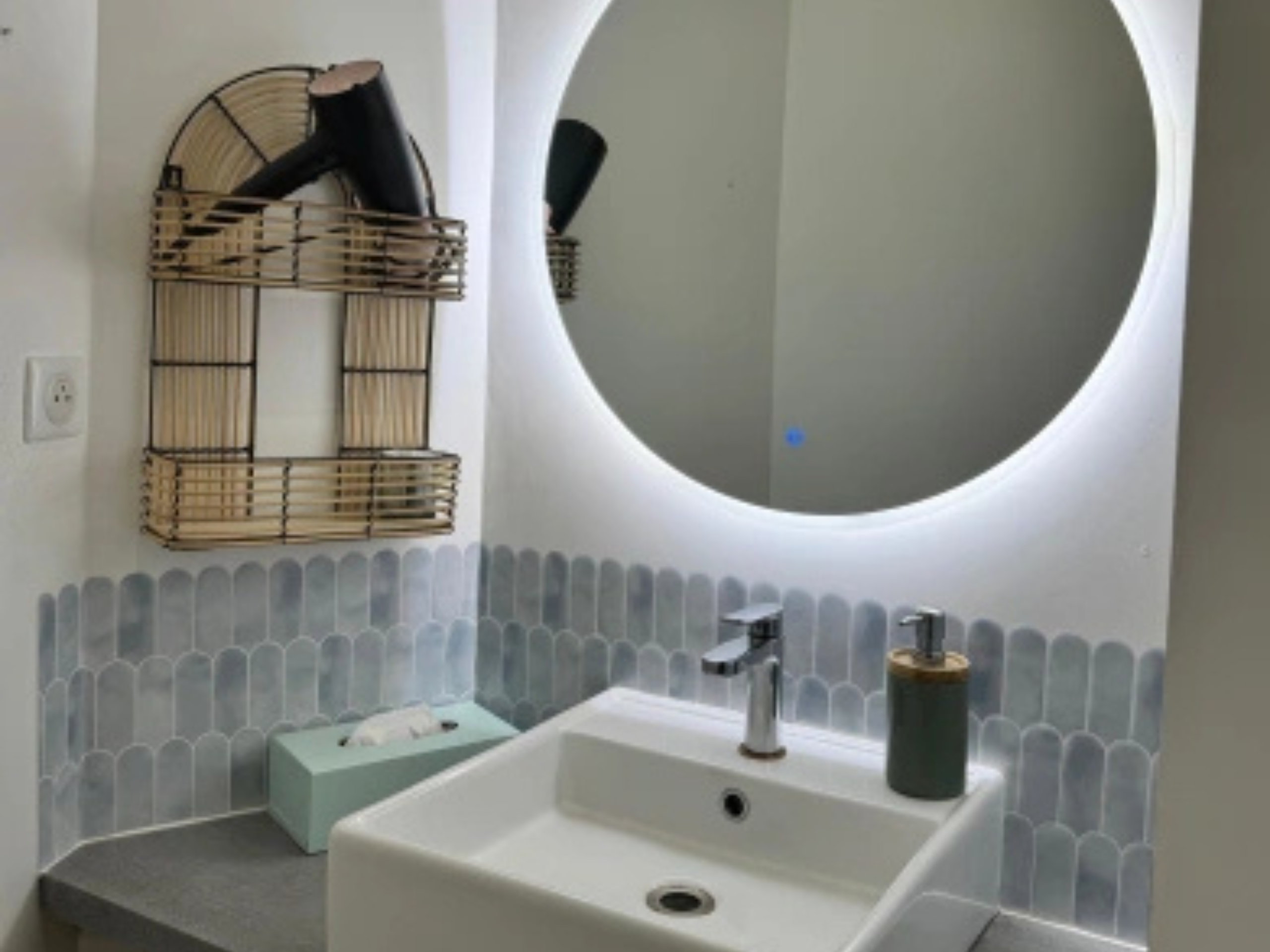 La salle d’eau privative comprend une douche à l’italienne, une vasque et des toilettes séparées.