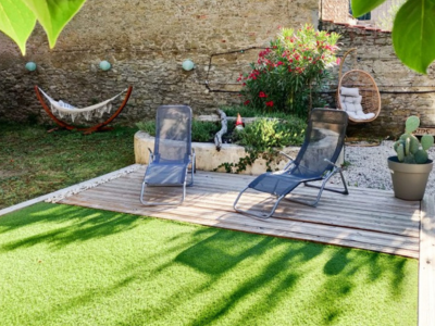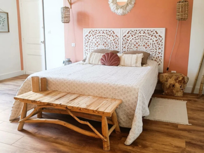Notre chambre avec terrasse à Carcassonne est la plus spacieuse (32 m²). Sa grande terrasse privative meublée, donnant sur le jardin, est parfaite pour savourer un café au soleil. Sa décoration bohème chic marie objets chinés, matières naturelles et touches vintage pour créer une atmosphère lumineuse et inspirante.