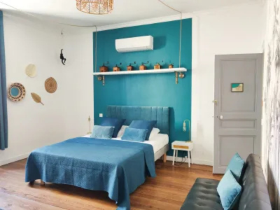 La chambre Célèstre est idéale pour un séjour romantique à Carcassonne. Inspirée par le design nordique, elle mêle teintes claires et lignes épurées. Son petit balcon baigné de lumière le matin invite à savourer un moment de détente. Le lit queen-size et la salle de bain avec douche à l’italienne garantissent un confort optimal après une journée à explorer la Cité médiévale.